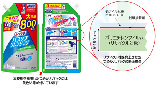 積層フィルムの貼り合わせ層間に特殊な接着剤を使用し、アルカリ処理により接着剤が溶解することで、多材質の積層フィルムからポリエチレンフィルムを高純度な単一素材としての回収可能なパウチ